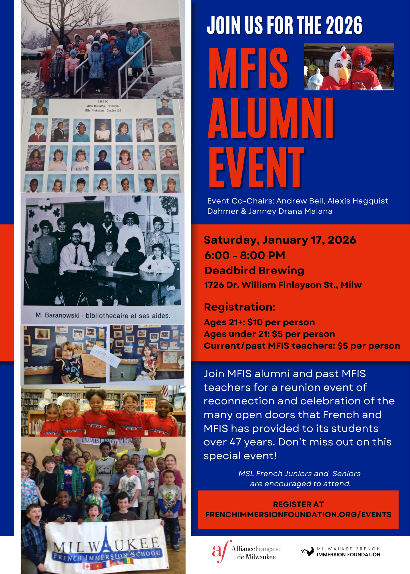 Join MFIS alumni and past MFIS teachers for a reunion event of reconnection and celebration of the many open doors that French and MFIS has provided to its students over 47 years. This will be a fun, social night with games, memories, swag and hearing the stories from MFIS alumni about their successes. MSL French juniors and French seniors from MSL (Milwaukee School of Languages) are encouraged to attend. Don’t miss out on this special event!